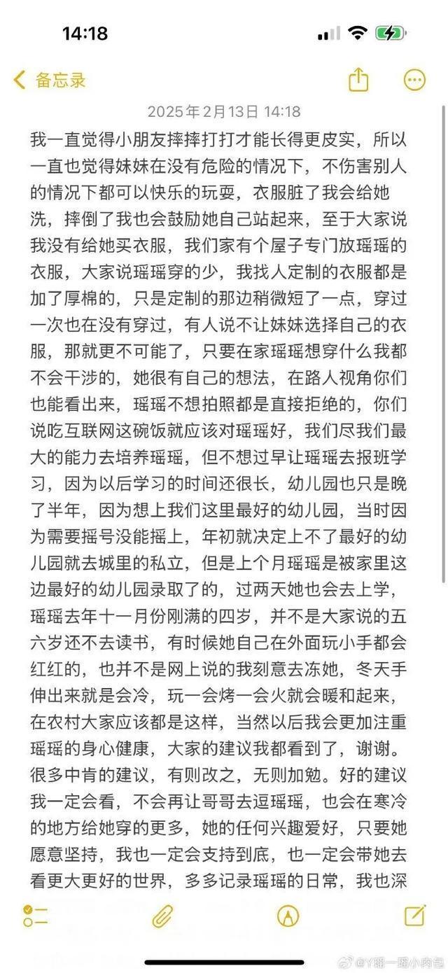 “瑶一瑶小肉包”母亲在账号发布回应:“我一直觉得小朋友摔摔打打才能长得更皮实,所以一直也觉得妹妹在没有危险的情况下,不伤害别人的情况下都可以快乐的玩耍,大家的建议我都看到了,谢谢。很多中肯的建议,有则改之,无则加勉。 如果我真的为了挣钱连孩子身心都不顾了,我一定会比现在挣得多十倍,但是从中衍生出来很多恶意造谣请立即停止,再次谢谢大家的关心!”