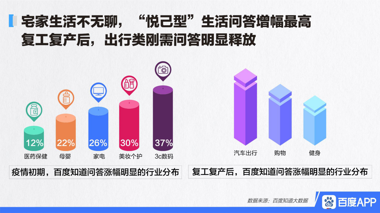 疫情初期时,消费决策类问答变得异常活跃,并非只是救猫救狗相关。其中有人反复去比较iPhone XR跟XS的区别,还有人于奥迪A6L以及A6之间陷入纠结。线下门店关闭了,然而大家却变得更加谨慎,几千上万块的耐用品要问清楚后才敢下单。百度知道数据表明,这类售前提问集中在3C以及美妆领域,这与其说是购物,倒不如讲是普通人处于不确定时期对每一笔钱进行精打细算。