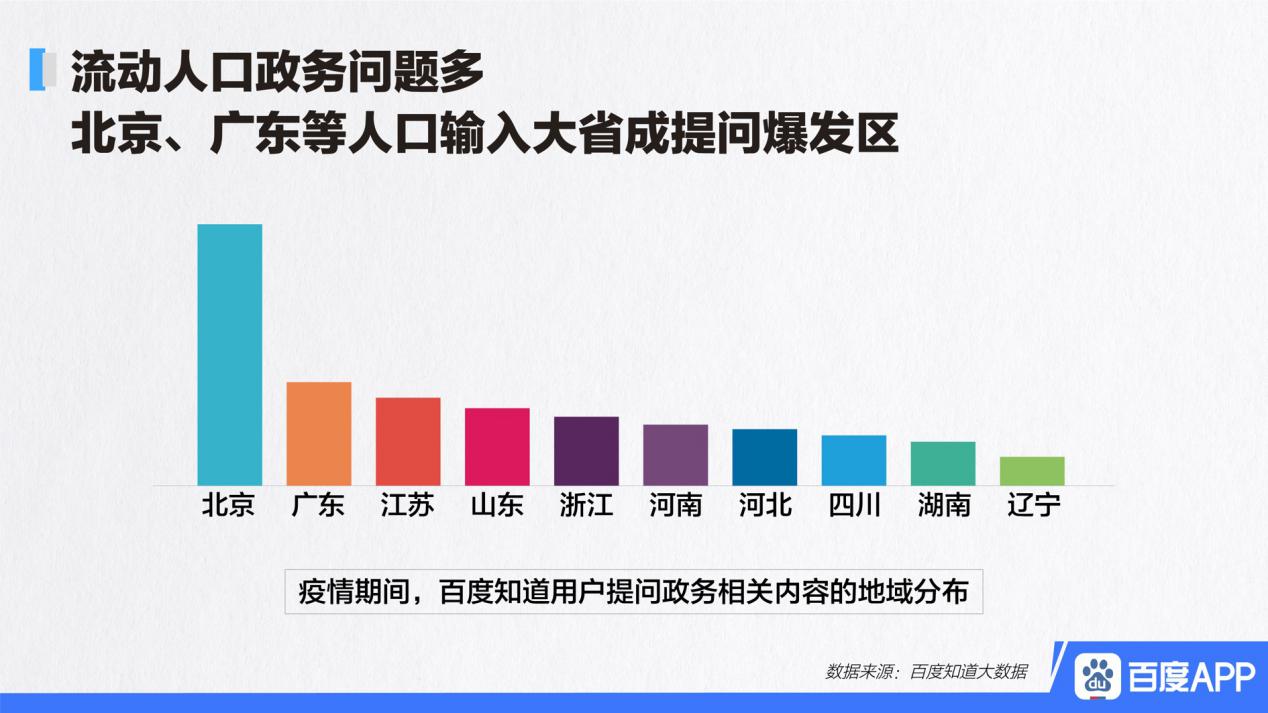 复工令一经发出,人口流入较多的大省份立刻就成为了提问极为集中的重点区域,北京、广东、江苏等地的百度知道用户疯狂地进行刷屏,他们纷纷提出,返京是否需要接受隔离,进入广东需要办理什么手续,社保减免该如何进行申报,4.16亿次的政务咨询,单日之中最高突破了千万次,这哪里是什么问答的平台呀,简直完完全全就是在线上的 “信访办” 啊!