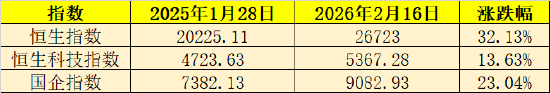 2月16日消息,港股三大指数集体上涨,截至收盘,涨0.59%,报26723.00点,涨0.13%,国企指数涨0.56%。从蛇年全年表现看,恒生指数累涨超32%,恒生科技指数累涨超13%,国企指数累涨超23%。