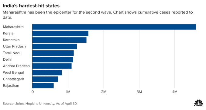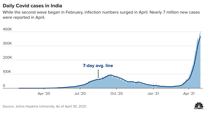 印度于今年一月开启大规模疫苗接种,然而其推进速度远远未达控制疫情所需的水平,截至四月底,印度全国总共接种了大约一亿五千四百万剂疫苗,这表明全国仅仅只有约十分之一的人口接种过至少一剂的疫苗。