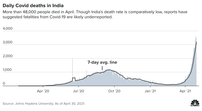官方所统计的数据表明,印度在四月份的时候,新冠死亡病例超出了四万八千例,日均死亡的人数从月初大概一千人,攀升至月底的三千人。尽管相较于其他国家而言,印度所报告的新冠病死率好像不算高,然而多个国家的媒体以及卫生机构都指出,实际的死亡人数极有可能被大幅度低估了。