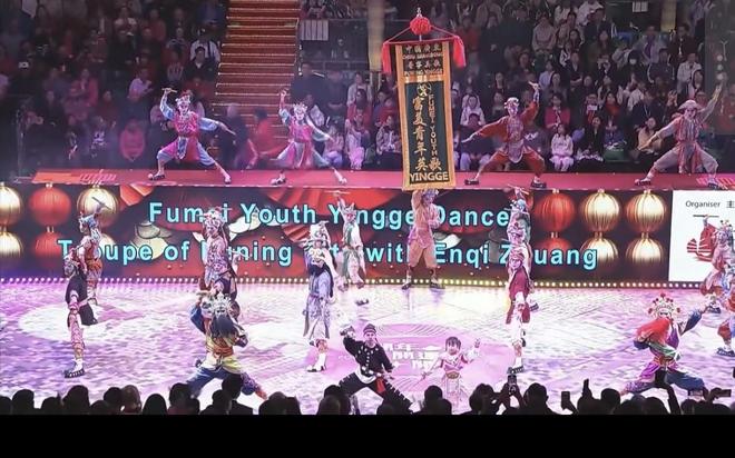 大年初一晚,香港,庄恩琪(中右)与普宁富美青年英歌队上台表演