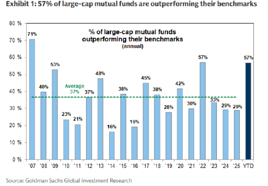 “许多主动型基金经理未必是‘反科技’,他们只是不愿继续为那几只拥挤的超大盘和软件股支付高溢价,也不愿打着‘主动’管理的旗号却紧贴基准操作,”Roundhill Financial首席执行官Dave Mazza表示,“在领涨力量扩大、更多板块开始发力的轮动行情中,愿意持有科技板块以外资产的策略终于开始见到了回报 —— 这种配置不再是阻力,反而成为助推。”
