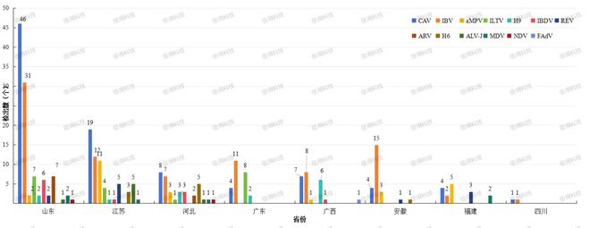 CAV的检出率高达百分之四十六点六,尽管数据与上周相比稍微有所降低,然而接近半数鸡场带有病毒这一情况不容被忽视。更需要提高警觉的是,CAV呈现阳性的场所以往常常同时存在MDV、REV等多种具有免疫抑制作用的病毒,山东、福建等地域的MDV检出率达到百分之二十二点九,从而形成多重感染协同效应。