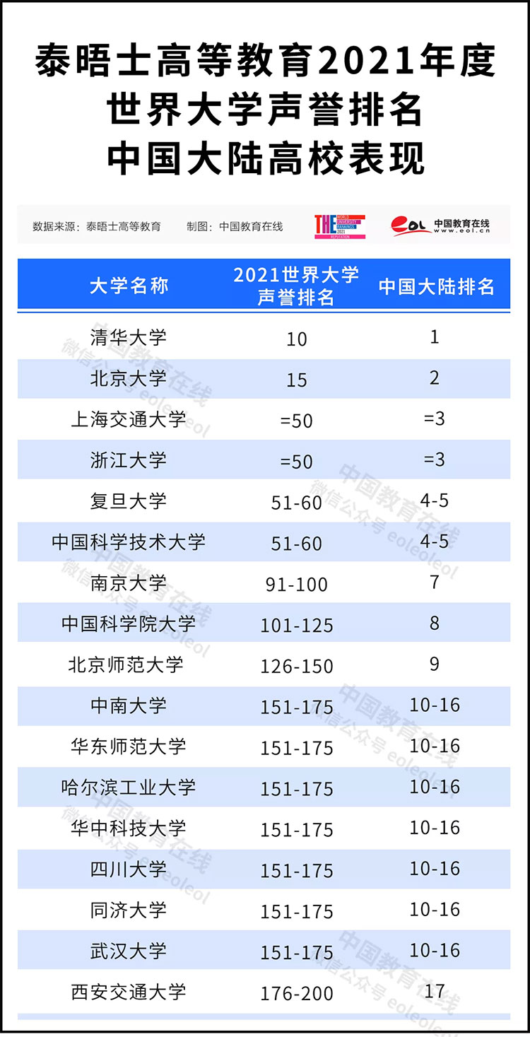 泰晤士高等教育2021世界大学声誉排名最近公布,这份榜单当中,最令人瞩目的是中国大陆高校的整体崛起,清华成功打入全球前十,另外有7所高校跻身前100,17所高校上榜创造了历史成绩,这表明中国大学的国际声誉正在切实地提高,并非仅是自我宣扬。