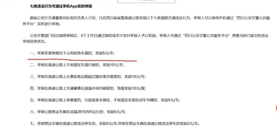 事实上,全国好多地方都存在类似的高速违法举报奖励举措,只是金额差别极为显著。四川高速所公布的奖励标准表明,举报占用应急车道的情况,给予每车 5 元的奖励,举报不按规定车道行驶的状况,每车奖励 10 元,举报超员载客行为同样是每车 10 元,而交通肇事逃逸破案之后,每案奖励 10 元。其他一些诸如遮挡号牌、凌晨违规运行客运车辆等违法行为,奖励金额处于 2 元至 5 元的范围之内,并且同样设定了每月不超过 100 元的奖励上限。