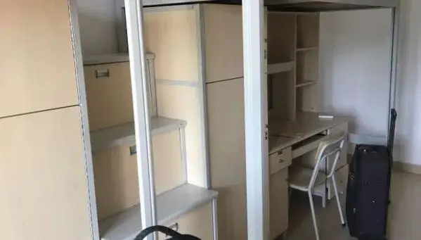 专人每天打扫宿舍楼道,保持着老建筑的整洁,四人间配置上下铺,每人配有书桌、书架和衣柜,初看朴素,收拾后很有生活气息。