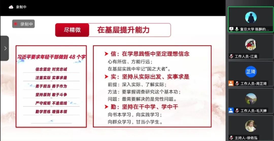 复旦大学博士生讲师团的团长毛天婵,以两个“新”对本次活动予以总结,其一为主题设计新,即在新的起点之上,努力做好“答卷人”;其二是宣讲形式新,此形式中,不但有在校的学生参与,而且还有身处一线的选调生加入,扎根于祖国广袤大地。