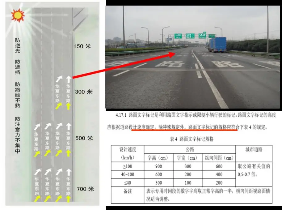 路侧路面文字在出口附近所设,此叫做那“蜂足”,它可有效解决一常见难题,早晚阳光强烈之际,高处交通标志牌因逆光常难辨认,或被前方大车遮挡;此时低下头来观察路面反倒更显清晰。