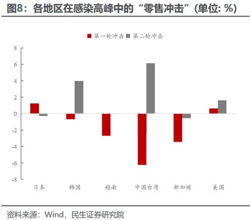 经过第一波之后,病毒未曾消失不见。在日、韩、新加坡、德国这些地方,均出现了第二个乃至第三个“感染波峰”的情况。举例来说,日本于2022年6月又启动了新一轮感染上升阶段,一直到8月才宣告结束。然而,有趣的是,后续这几波对于经济的冲击显著变小了。多数国家在第二轮疫情高峰之际,零售数据不但没有下跌,有的甚至还呈现往上走的态势,比如中国台岛地区在第二轮冲击之时消费反倒有所回暖。