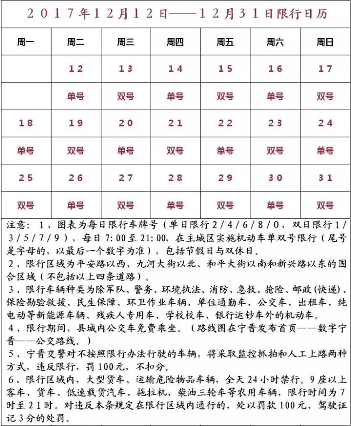 12月30日,在周六这一天,双号牌照的车辆能够通行,单号的车辆被禁止上路。12月31日,到了周日,情况反过来了,单号车辆可以通行,双号车辆则被限行。元旦当天是不是继续限行,这需要等待县政府最新的通知,车主们需要留意手机短信以及官方公众号。