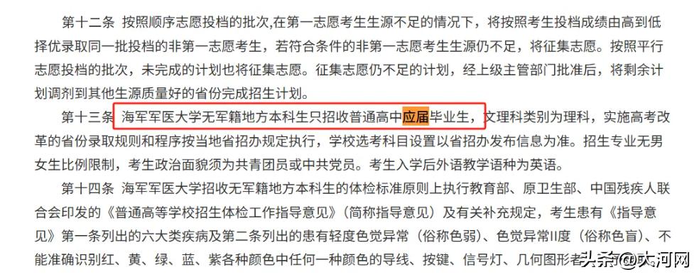 在2025年没军籍的地方本科生招生里,三所军医大学统一了说法,那就是口径。海军军医大学表明只招收普通高中应届毕业的学生,陆军军医大学提出考生得是普通高中应届毕业的学生,并且政治面貌是中共党员或者共青团员,空军军医大学也同样限定了是应届生身份。五所学校在2025年的招生政策方面维持了高度的一致。