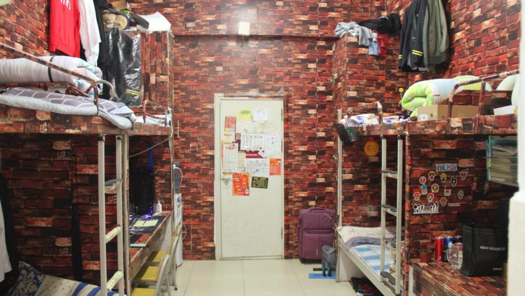 宿舍为标准六人间,床铺在上桌子在下,其内部空间颇宽绰,设有小阳台,每个房间皆配备有空调以及洗衣机,具备独立卫浴,热水按不同时间段供应。