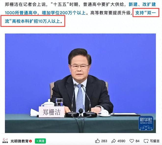 国家“十五五”规划清清楚楚地表明双一流高校得进行扩招,在五年的时间里累计扩招数量超过10万人。按照相应折算的结果来看,在2026年这一整年,双一流高校相比去年要多招收2万多名学生。把这个数字放置在以前情况之下,足足够好几个省份的尖子生去分配了。