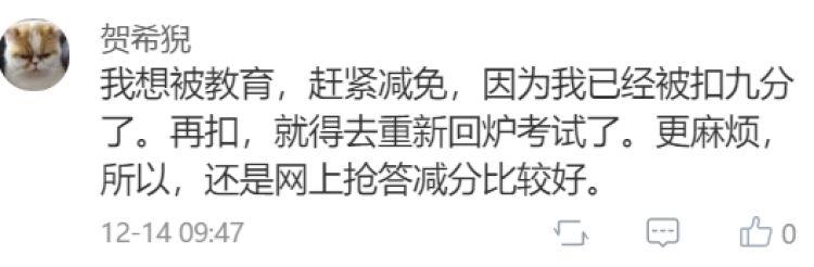 消息一经传出,马上于网络之上引发了热烈的讨论,截止到11月14日,人民网微博所发起的一项投票,已经有6255人参与其中,当中66%的网友对“教育是根本”表示支持,觉得借助教育来提升安全意识,相较于单纯罚款而言,更具备长远的意义,有网友将自身经历分享出来讲道:“扣分结束之后要重新进行考试,会更加麻烦,在网上做题反倒便捷。”。