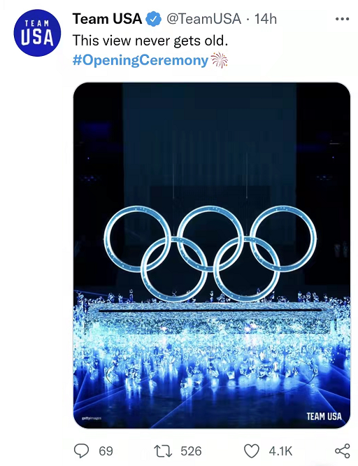 今日,美国的网站,用“耀眼夺目”一词,去形容开幕式。华盛顿邮报直接表明,这是视觉方面的享受。卫报给出评价,称“令人叹为观止”,还说这是一个充满希望的起始。美国奥运代表队官方所拥有的账号,在第一时间晒出照片,发出感叹,精彩的时刻绝不会褪色。NBC专门对高科技元素予以关注,泰晤士报向观众讲解中国的24节气文化。