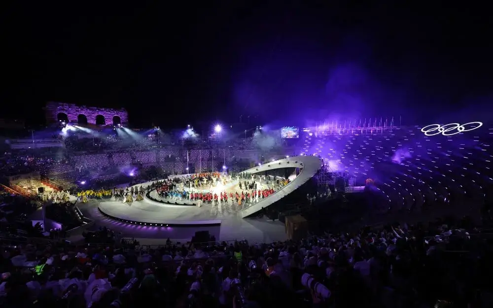 在公元一世纪便已存在的古迹维罗纳竞技场,于2月22日晚摇身一变成为冬奥会闭幕式的现场环境。奥运会历史上破天荒地将仪式安排在被列入世界文化遗产名录的历史古迹里进行举办,使得石头看台与现代灯光相互映照彼此生辉。现场有2万多名观众坐在往昔古人观看角斗的石阶之上,欣赏着以“行动之美”作为主题的表演内容。意大利歌剧选段在古老石墙之间来回飘荡回响;冬奥会主题从这一时刻正式开启向四年后的法国进行传递。