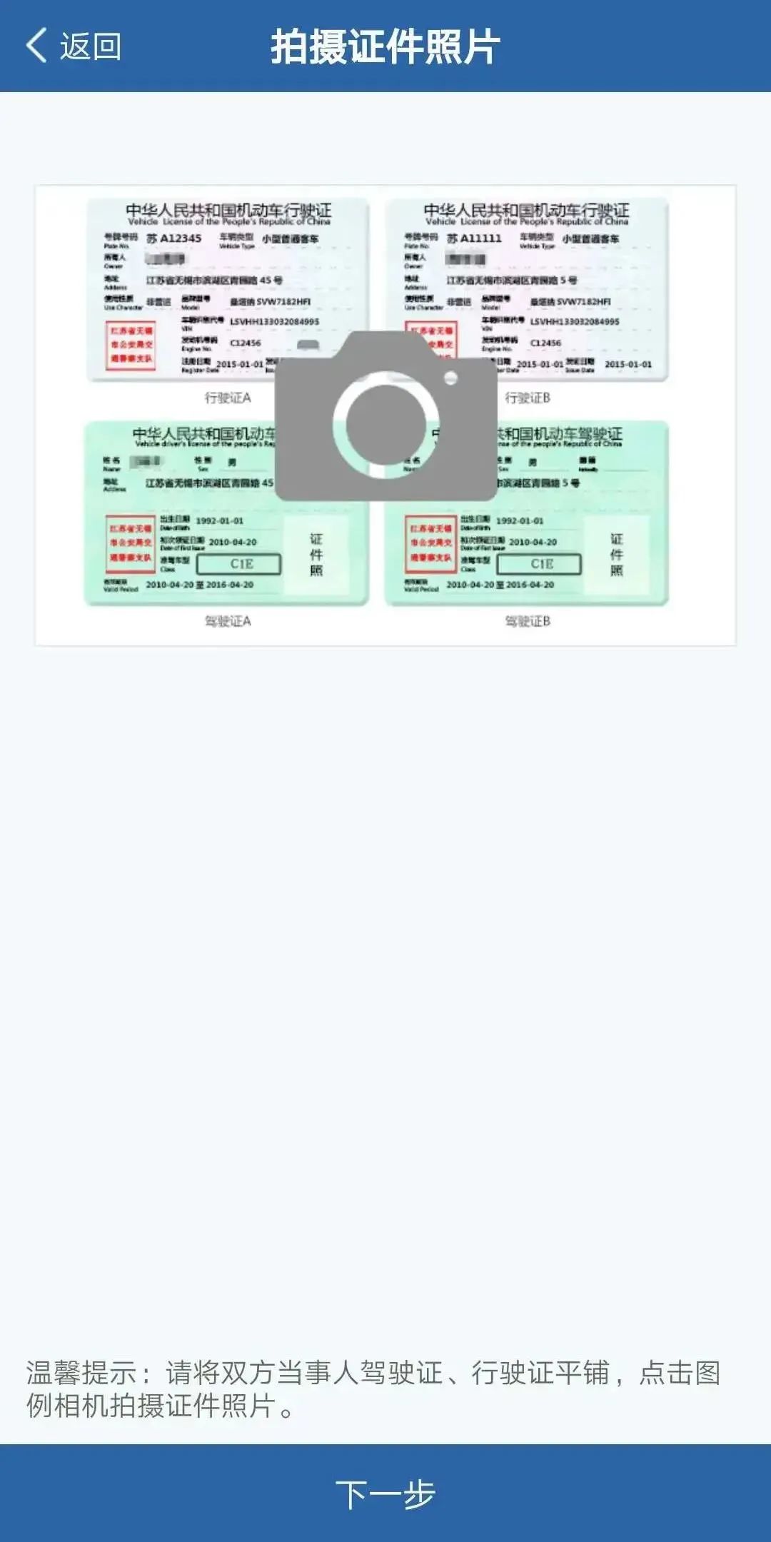 车辆被二者均移至路边安全地带以后,APP会引导着进入第二步,即信息录入 此时少不了对于双方驾驶证以及行驶证予以拍摄,要记着把证件平铺开来,确保对焦清晰,达到上面姓名啦、证号等之类信息能够清楚地被识别的程度,系统届时会针对其中一部分内容给予自动识别而后填充。
