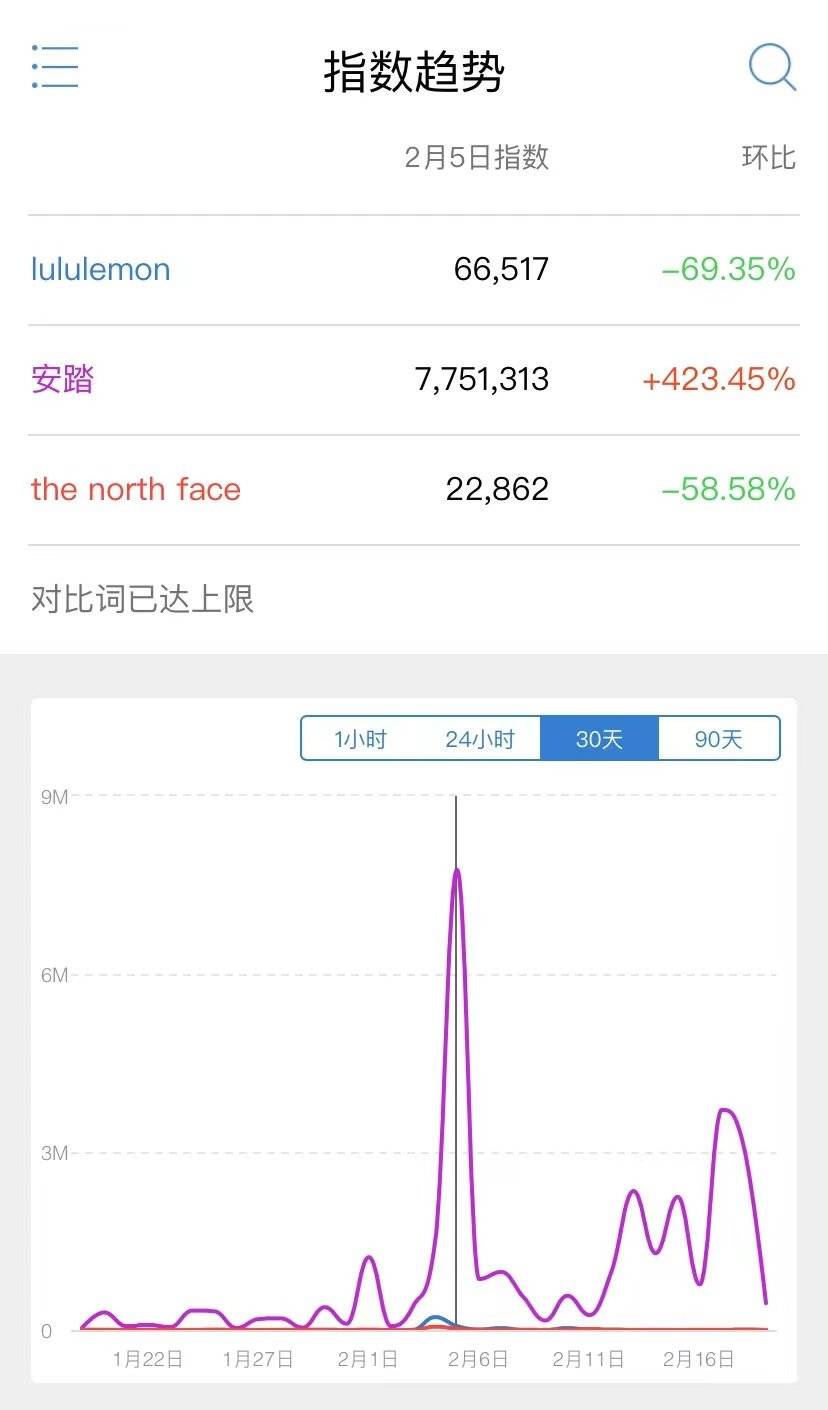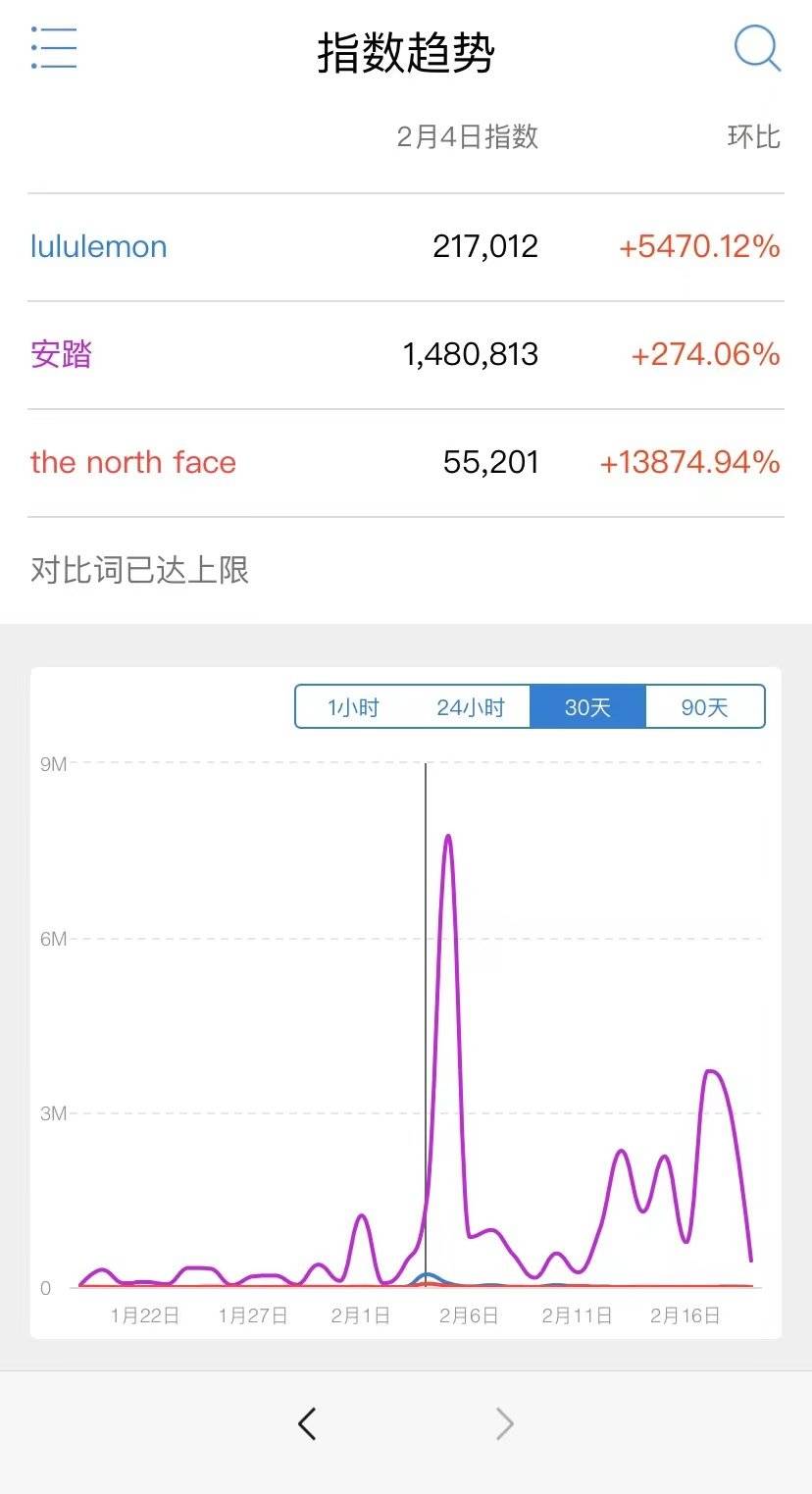 在2月5日,这成为了多个服装品牌的高光时刻,那个属于它们绽放光彩之时刻。加拿大品牌lululemon于抖音的搜索指数急剧飙升至699万,其环比增速是高达3519%那般惊人 ,此外安踏是以128%的增速紧紧跟随于其后。就在这一天 ,差不多所有和冬奥相关的服装品牌都迎来了流量洪峰 ,众多用户是纷纷去搜索同款开幕式服装 ,在社交媒体之上满是对运动员入场服饰的讨论。数据所显示的是 ,北面、优衣库等品牌即便也存在曝光情况 ,然而其声量却并未同步得到放大。