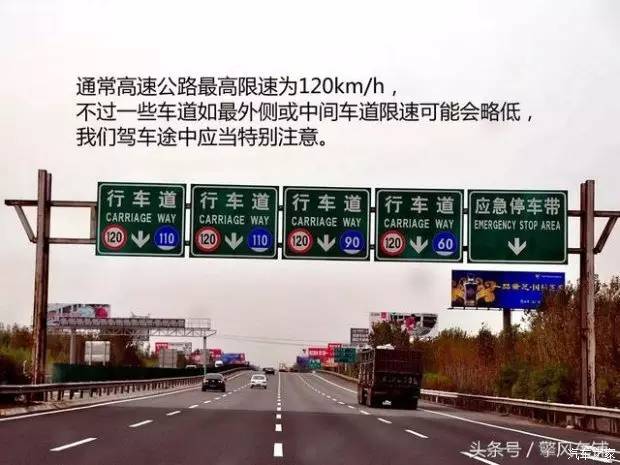 在高速之上,最高限速一般而言是每小时一百二十公里,然而外侧车道的限速会相对有一些低的情形,像是一百或者八十,这些限速的牌子通常悬挂于车道的上方或者右侧之处,在开车之际要加以留意,不要因为没有看清楚从而出现超速的状况。