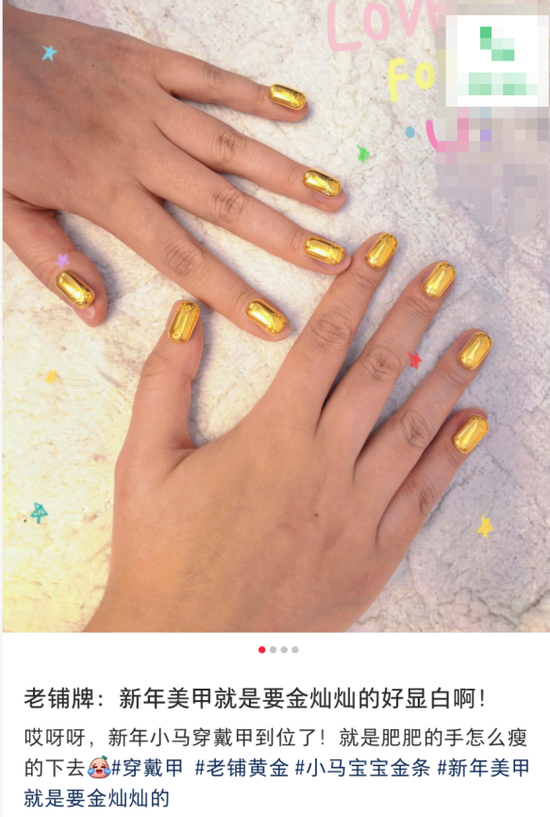据《每日经济新闻》报道,周大福等头部品牌的小件金饰,甚至老铺黄金的金条都成了美甲店的“高端原料”,有消费者表示,愿意花数千元、上万元打造“黄金甲”。