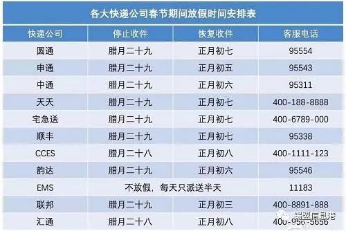 最后揽件时间被统一定于腊月二十九,也就是2月14日的快递公司有圆通、申通以及中通、天天、汇通、宅急送、顺丰、CCES、韵达等主要快递公司 ,这表明2月14日之后,这些快递公司将不会再接收新的快件,上班时间存在些不一样 申通在正月初五也就是2月20日最早恢复 中通和韵达于正月初六也就是2月21日上班 圆通、天天、汇通、宅急送、顺丰则要等到正月初七也就是2月22日 CCES最晚 正月初八也就是2月23日才开始正常揽件。