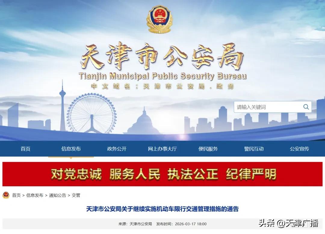 这次采取限行措施所依据的是什么呢,是天津市公安局网站在3月17日发布的一份通告,通告的名字是《天津市公安局关于继续实施机动车限行交通管理措施的通告》。这份通告是经过市人民政府批准的,它明确表述了在2026年3月30日至2027年3月28日这个时间段内的限行具体细则。