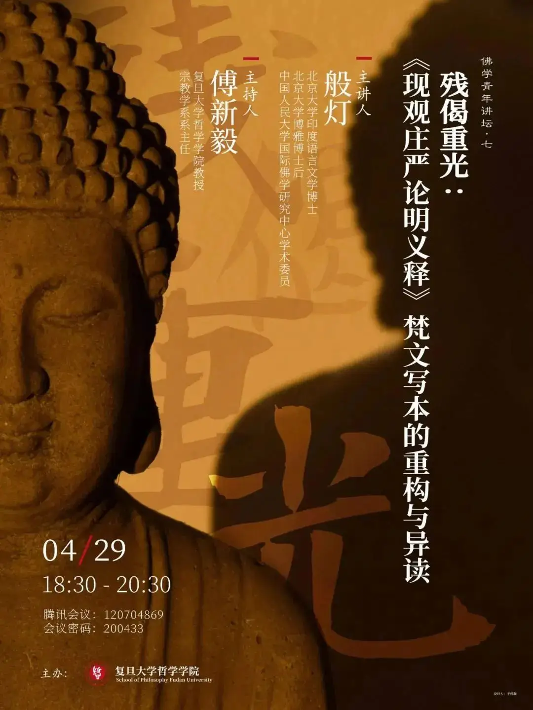 在晚上六点半这个时分,马克思主义学科周与星空讲坛联合推出了一场主题为“五四改写了中国人的时间”的讲座,有三位来自复旦的学者,从不一样的角度对五四新文化运动展开解读。就在同一时刻,由哲学学院主办的佛学青年讲坛借助腾讯会议举行,那位般灯博士分享了关于《现观庄严论明义释》梵文写本的重构研究。这两场讲座,一场较为实在,一场偏向虚拟,它们既深深扎根于中国近代史范围,同时又深入到古典文献相关领域。
