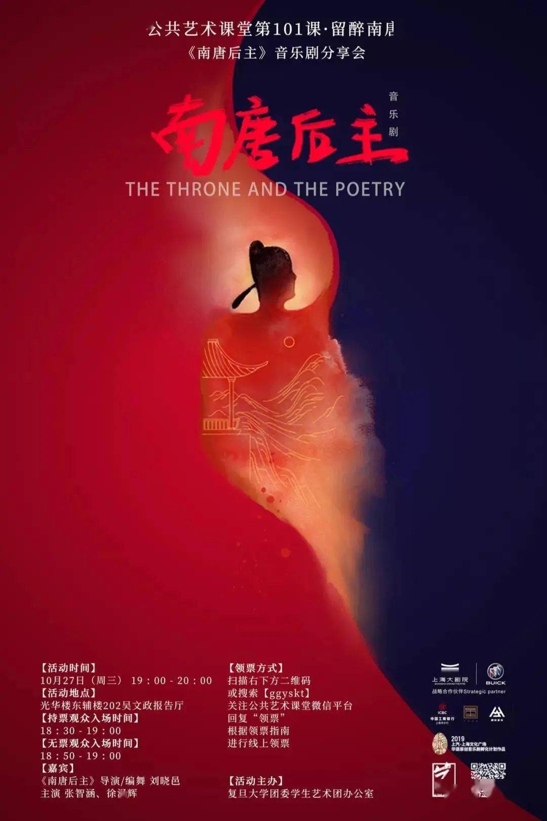 在同一天,公共艺术课堂的第101课,于光华楼东辅楼202的吴文政报告厅举行。其主题是“留醉南唐——《南唐后主》音乐剧分享会”。此活动邀请了音乐剧的主创团队,借助现场表演片段以及创作故事分享,引领观众踏入南唐后主李煜的艺术世界里。这样一种把古典文学跟现代舞台艺术相互结合起来的尝试,吸引了数量众多的文学和艺术爱好者参与其中。
