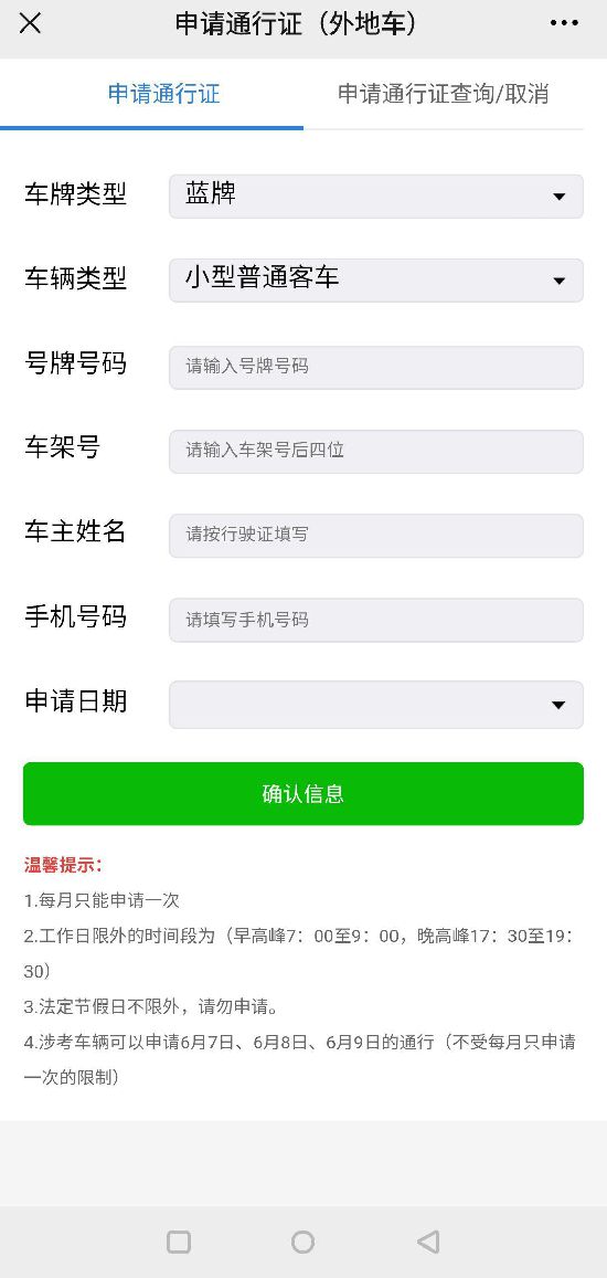 每月仅能够申请一回免限行,然而涉考车辆能够于6月7日至9日进行申请,并不受这一限制。法定节假日对外不限行,在这个时候不需要申请。在申请的期间要精确输入车主姓名、手机号码、车牌号码之类的信息,以此保证申请能够顺利通过。