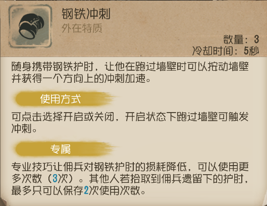 佣兵玩得怎么样,要看钢铁护肘用得是否巧妙。不少玩家手里攥着三个护肘,开局就被监管者打得只剩残血,后面救援没能力,致使整局游戏失败。实际上护肘不光是用来跑路的,更是牵制、救援、运营方面的核心道具,用正确了才能展现佣兵的最大价值。