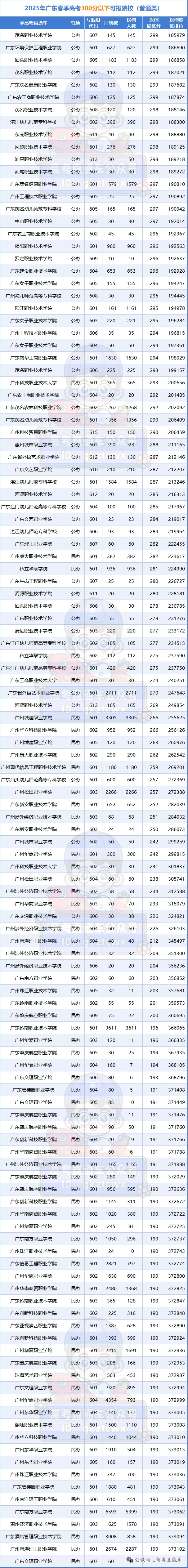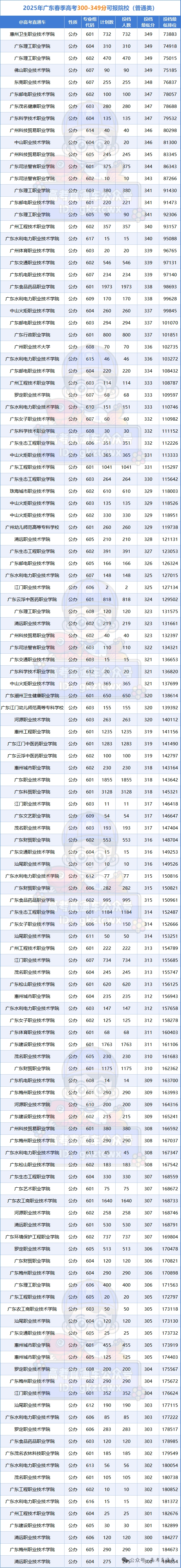 分数处于一定区段时,民办院校开始出现,然而仅有少数民办院校的专业组投档分堪堪能达到约300分。要是你的分数高于330分,那么还能够试着报考公办院校的普通专业组;要是分数低于320分,相较于去公办院校就读一个冷门专业,倒不如去考量民办院校的热门专业,像广州城建职业学院的工程造价专业,又或者广东岭南职业技术学院的护理专业,这些专业的就业前景并非不好。
