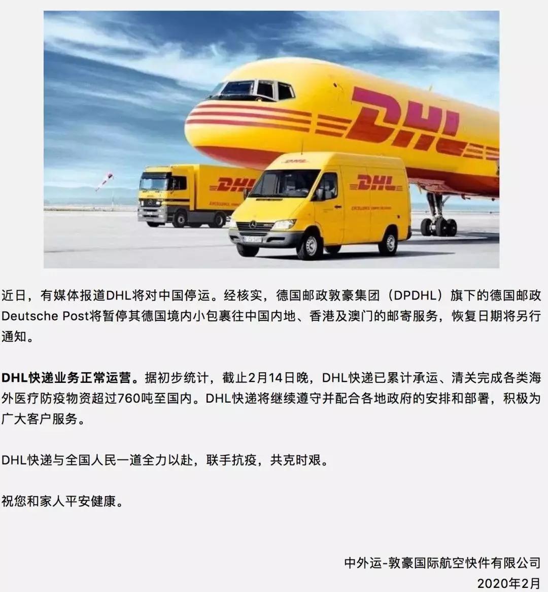 DHL集团之内,业务划分极为清晰,其快递业务所使用的乃是自身的飞机队,当下依旧如常飞往中国,依据2月14日的声明来看,仅仅是德国邮政这一部分面向私人客户的小包裹业务暂停了。
