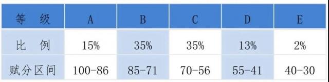 首先,转换规则是将考生原始分,自高向低划分成A、B、C、D、E五个等级,其中各等级人数比例,分别固定为15%、35%、35%、13%以及2%。接着,每个等级对应着一个赋分区间,例如A等赋分是100-86分,B等赋分是85-71分,依此类推。
