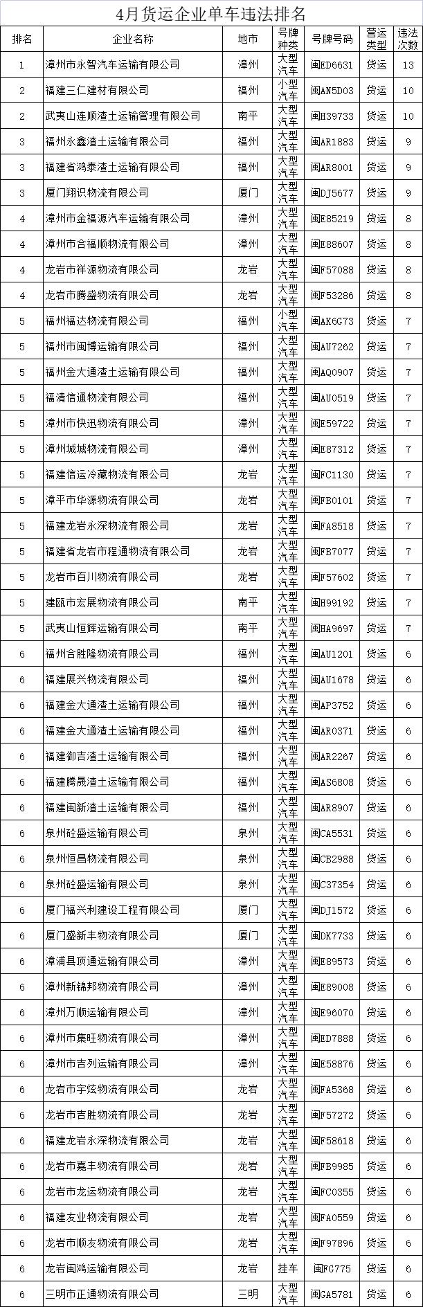 交警部门在公布违法企业之际,还把4月份违法排名较为靠前的车辆名单给列了出来,这些里边,有的小型货车于福州二环路频繁进行变道加塞操作,有的危化品运输车在沈海高速长时间占据快车道,在福州仓山有一位车主讲,曾亲眼看到一辆违法次数颇为多的大客车当众在市区随意停车以便上下客。
