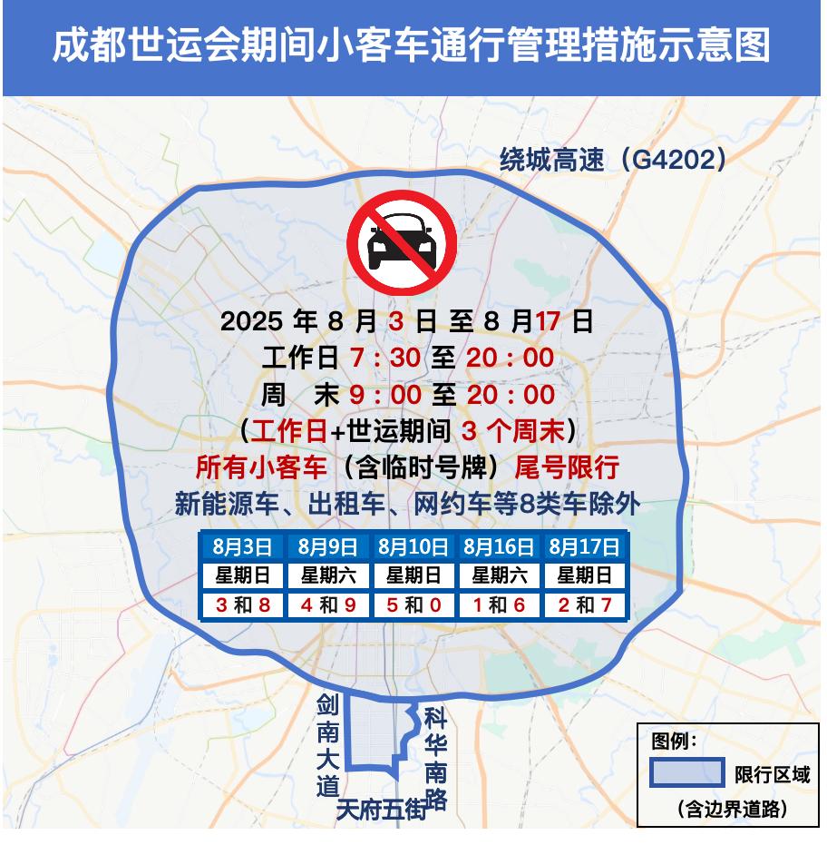 其次,限行区域出现了扩大的情况。传统的绕城高速以内区域自是不必说,此次特别将“成都高新南区绕城外部分区域”纳入了限行范围,所以居住在大源、中和一带的居民,务必格外留意自家所在路段是否处于管控区内。最后,讲讲限行规则,周末设有专属的尾号组合表,以此确保在整个赛期内,你的爱车在周末最多只会被限行一天。