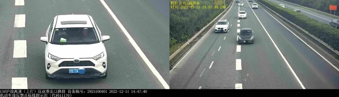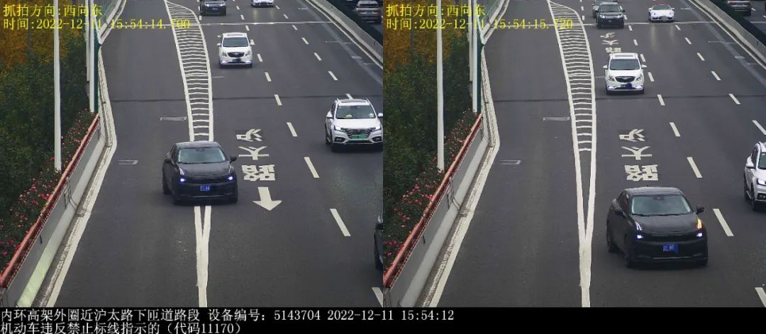 有众多驾驶员辩解称,自身压实线是源于“快错过出口了”,以及“导航播报太晚”。然而法律并不考量理由,唯看行为。拿 G50 沪渝高速赵巷出口来说,沪 DPU 与沪 ETA 两车在不同时间于同一地点违法,这表明此路段确实容易走错路。但正确的做法是,一旦发觉即将错过出口,就要保持在原车道继续前行直至下一个出口,多花费十分钟绕回来,这远比冒险变道安全而且省钱哟。