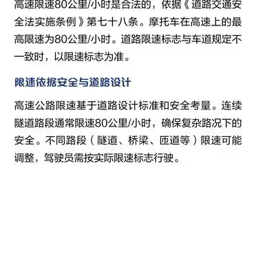 《道路交通安全法实施条例》第七十八条,对高速公路的车速,作了明晰规定。其中表明,高速公路最高车速,不得逾越每小时 120 公里。最低车速,不得低于每小时 60 公里,针对于摩托车,明确规定其最高时速,不得超出 80 公里。