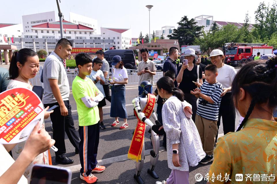 有一个特殊身影,在考点之外,吸引了众多目光,是一个身披红色绶带的人形机器人,在人群当中穿梭,它时而向考生挥手致意,时而大踏步走动,那些科技感十足的动作,引来了阵阵笑声,而这个机器人,是某科技公司特意带来为考生加油的。