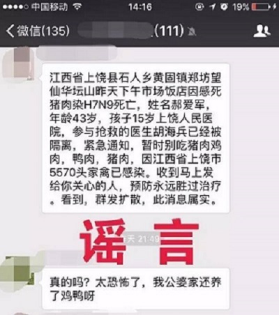 2月份,山东突然出现多条“H7N9疫情”消息,河南 2 月份也突然有了多条“H7N9疫情”信息,四川在 2 月份同样突然浮现多条这样的消息。这些帖子伴随着医院抢救照片,死亡者姓名被详细罗列出来,年龄也被详细列出,甚至还描述了患者曾接触过禽类的情况,不少市民信以为真,然后纷纷转发给亲友并提醒注意。