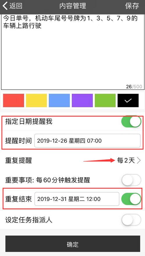 在便签之上,分别进而创建两条提醒,其一乃是单号日提醒,于其上写上这般话语,即“今日单号,尾号为1、3、5、7、9的车需上路”,并将其设置成每间隔两天提醒一回,结束的时间选定为31日晚上8点。其二则是双号日提醒,其同样是每间隔两天提醒一回。如是这般设置完好之后,每日之中该究竟是谁开车便能够清清楚楚了。
