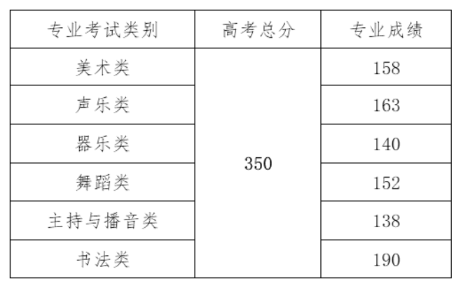 详细地去看,在今年的时候,艺术类本科对于文化课的总分具备的要求是350分。之中各个专业针对专业成绩所提出的要求分别为:美术类的要求是158分 ,声乐类的要求是163分 ,器乐类的要求是140分 ,舞蹈类的要求是152分 ,主持与播音类的要求是138分 ,而书法类的要求是190分。