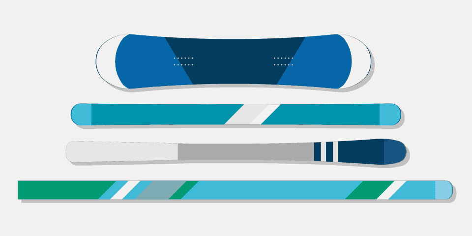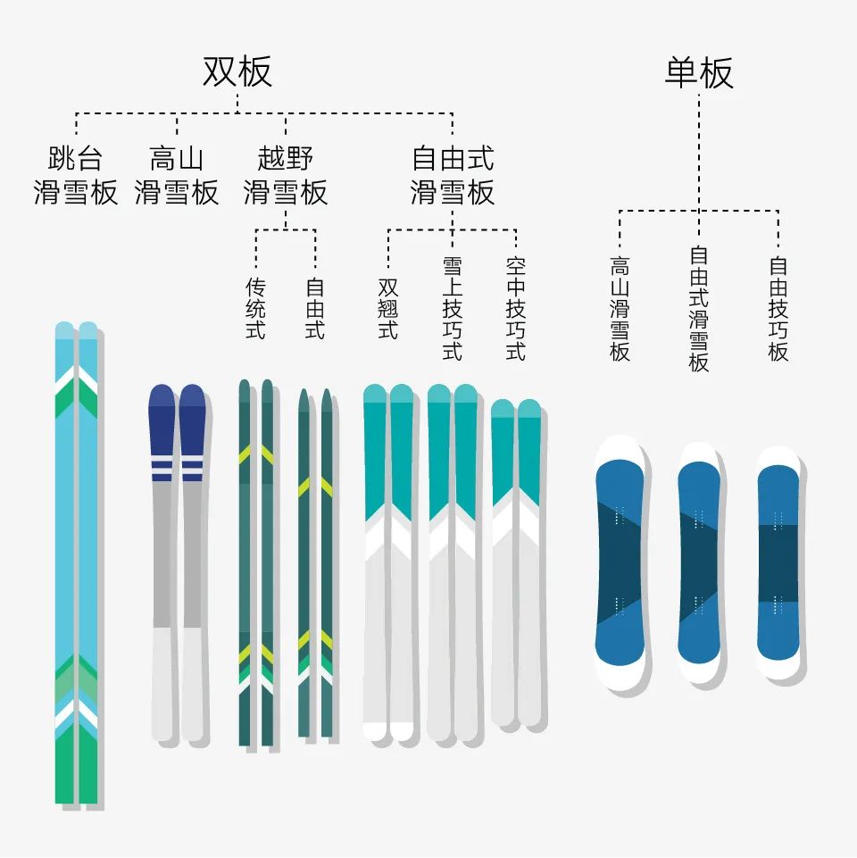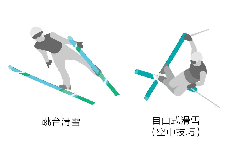 跳台滑雪所使用的雪板乃是所有双板之中长度最长、宽度最宽的,运动员腾空之后宛如长有羽翼,凭借板面条接住空气进而飛越至更远之处。自由式滑雪空中技巧的板子则短了许多,如此在空中做出翻跟头、拧转动作时才不至于相互碰撞。