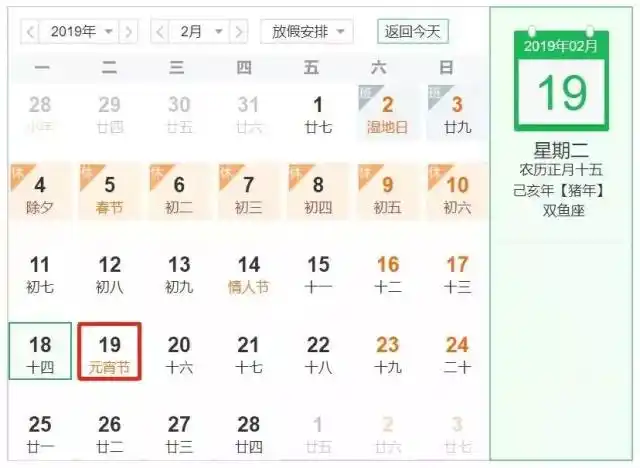 今年,2月19日是星期二,这一天是元宵节,在国务院发布的法定节假日名单当中,从来不存在元宵节这一项,所以,这一天,全国人民都需要正常上班打卡,学校要照常上课,单位要照常办公。