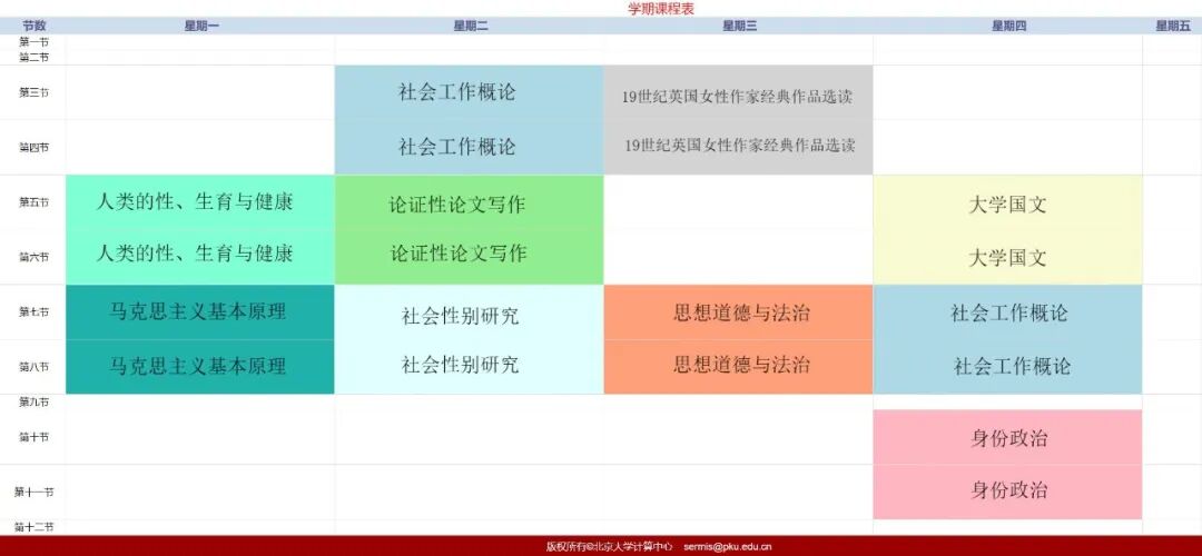 社系24级学生的课表,所透露出的是满满当当浓厚得化不开的性别研究气味,三门课程被安排在了一起,它们分别是《身份政治》,《社会性别研究》,还有《19世纪英国女性作家经典作品选读》,她曾经去旁听《身份政治》这门课程,在课堂之上同学皆围坐起来展开讨论,那种充满着思想相互碰撞的氛围,使得她一直难以忘怀,对《社会性别研究》课程的选择源自于一次讲座,佟新老师身具的温柔亲和慈爱以及学识的渊博深厚,深深吸引住了她,至于英国女性作家作品选读这门课,乃是为了弥补初高中时期很少阅读外国小说所留下的遗憾,《傲慢与偏见》,《呼啸山庄》这些长久听闻其大名的经典之作,终于赐予了有机会能够细细品读。