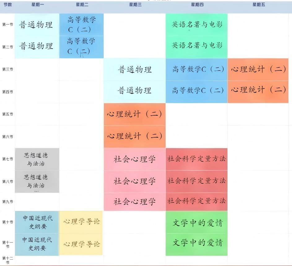 心理与认知科学学院二零二四级的本科生,在这一学期,要去面对难度有所提升的《高等数学》以及《心理统计》课程。然而,最喜爱的依旧是《社会心理学》,毛利华老师讲,这门课程乃是心理学体系里最为核心且最为优雅的部分,毕竟人类恰恰是在他人的影响之下才产生行为的,并且是在社会关系当中构建自我概念的。由于毛利华老师所具备的魅力,她甚至于选择去旁听《心理学导论》,想要借助不一样的视角去回顾上一学期的内容。《文学中的爱情》同样是慕名而来,期望丛治辰老师的见解能够与心理学视角形成交互。
