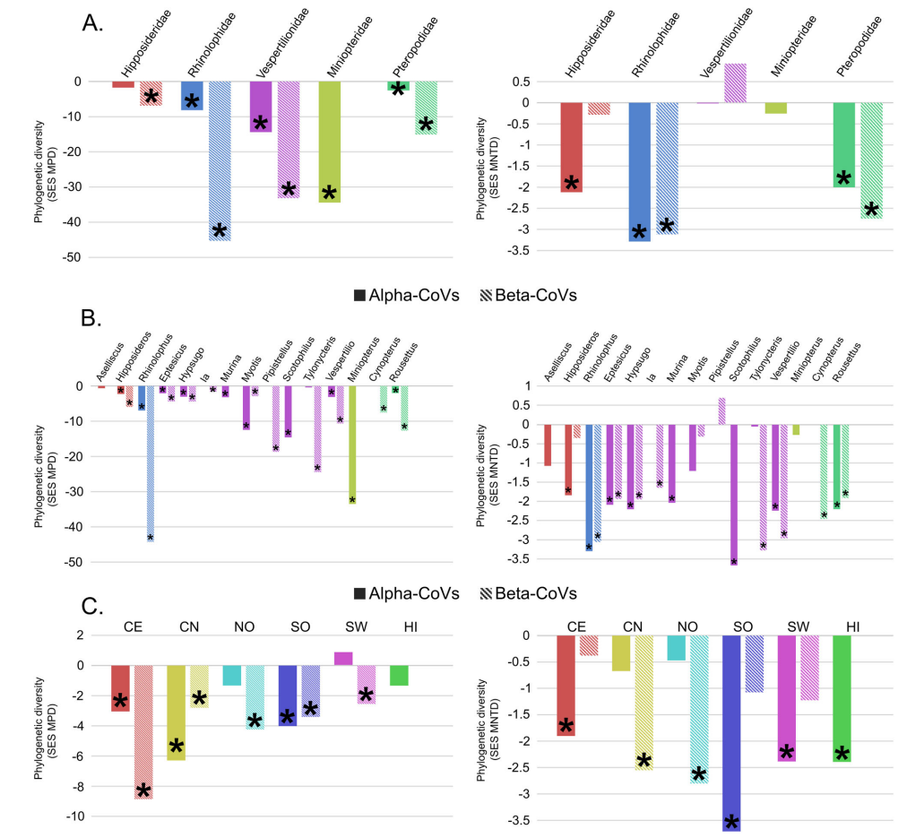 明确指出需要重点关注的蝙蝠类群的是研究团队,其中包括马蹄蝠、扇蝙蝠、大夜蝙蝠以及小翼蝙蝠等,这些蝙蝠所携带的α冠状病毒更易于跨物种传播,对于人类和家畜而言潜在风险更高,未来采样以及监测应当优先覆盖这些类群。