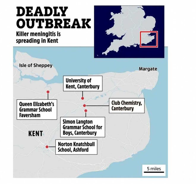 倘若接触到细菌,这部分人群于感染之后朝着侵袭性感染发展的风险,相较于接种过疫苗的人而言要高出许多。这同样阐释了为何此次疫情会在大学生群体里集中暴发。疫情的源头乃是肯特郡坎特伯雷的一家夜店所引发 的超级传播事件,众多学生在聚会完毕之后相继发病,仅仅经过短短十几天便扩散至校园以及社区。