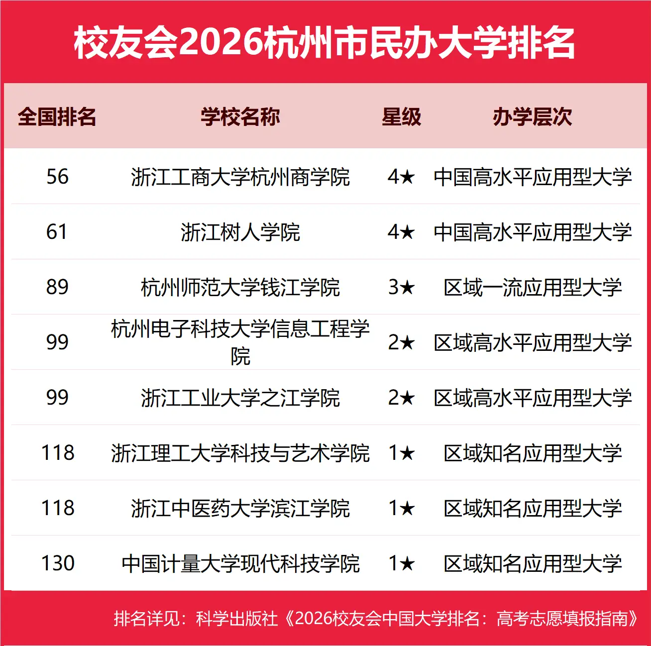 全国民办大学排名里,浙江工商大学杭州商学院处于并列为第56名的位次,于杭州市的民办大学当中居于首位,这所学院凭借浙江工商大学的商科的具备优势之处,在经管类专业领域有着比较强的实力,浙江树人学院排于第二,作为一所历史较为长久的民办高校群体里头的一部分,它在多学科协调发展方向存在方面积攒下了经验,杭州师范大学钱江学院排列在第三,其于师范类专业的办学质量收获到了认可。前十的名单里有杭州电子科技大学信息工程学院,也有浙江工业大学之江学院,还有浙江理工大学科技与艺术学院等,这些独立学院多数凭借母体高校的学科资源,在工科取向以及艺术等方面打造出了自身的特色。